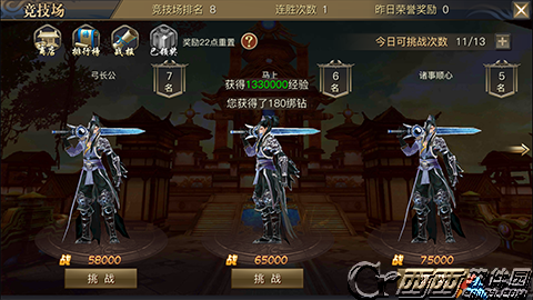 竞技场的奖励比较单一,当玩家们成功的挑战了一名排名比自己高的玩家的时候,便可以获得经验值、金币以及荣誉值作为奖励,并且还会有排名奖励噢。排名奖励在每天晚上的十点重置,奖励的丰厚程度根据自己排名来定,排名越高,所获得的奖励越丰富,排名低,奖励也低。