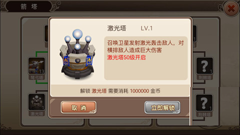 在主角达到30级的时候回解锁巨炮塔和弩弓塔;而达到50级后会解锁激光塔和攻城塔!