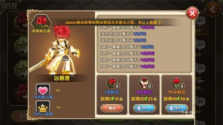 3.精力:精力是骑宠获得星石从而升级的主要条件,没精力了?精力买完了?着急升骑宠?这都不是事儿,点开你的好友!送花,就送9朵玫瑰,20精力9钻。看样子也不比系统卖的贵哪儿去嘛,而且还有人品拿,人品达到一定要求还会获得专属称号!