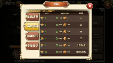 2.段位赛:不要觉得段位赛一天五次打完了就没用了,前五次固然很重要,但是段位赛为什么叫段位!那是因为段位的提升也是有好处的,这个每天具体次数不太清楚,有朋友说30次左右,段位高了还能拿称号,SSS那个称号增加属性简直逆天!