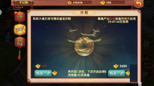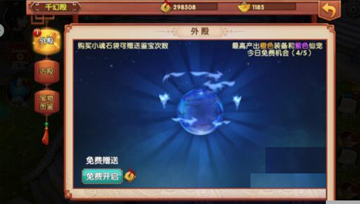 “外殿”通过消耗铜币来进行开启,最高可以产出橙色装备和紫色仙宠,每日都有固定的免费开启次数,开启一次以后有一定的冷却时间,如果你购买小魂石袋,系统会送你一定的开启次数,当然若是猎妖师的铜钱足够,九妹建议可以直接开启十次,这样会更大几率获得橙装和紫宠。