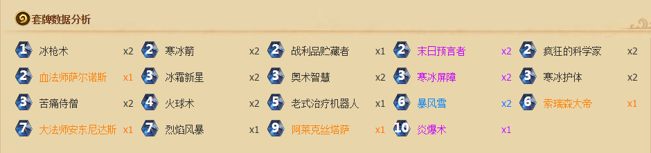 谈及冰法,不得不承认这套卡组正是如日中天。尽管冰法很被咆哮德克制,以及对防战束手无策,你基本有90%机率输给这两套天敌套牌。但冰法仍然从一堆德鲁伊中寻觅出一条重回天梯顶端的道路,盖因冰法能克制除咆哮德以外的所有主流卡组,环境内有多少非德鲁伊套牌是冰法能否适宜的基本条件。