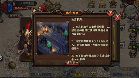地宫长廊之中在二层的地宫神殿可以使用魔族指令书召唤新的BOSS,注意进入地宫长廊需要队长使用地下卷轴才能够进入!