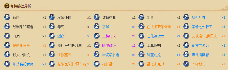 宇宙贼很要命的一点是,背刺,刺骨只带一张,这样一来解场的能力,基本是下降大半。空出来的卡位,我选择了黑铁潜藏者尝试拟补,实用效果还不错。贼的法术选择真的不多,回头看看盗贼真的很多版本没有更新伤害法术了。