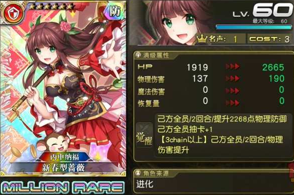 新春型蔷薇,富豪3C火属性物盾。2665的血量和2268的物理防御,还有3chain物理伤害提升,和是天依蛋池联动卡如出一辙,良心十足。