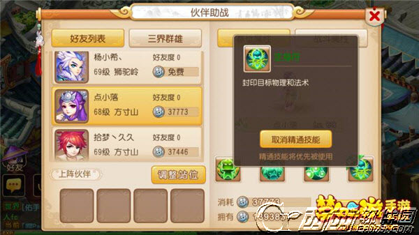 2.排行榜中方寸“壕”友。如何弥补紫霞仅仅控制法术的问题,找到定身符的封印小伙伴呢?在排行榜中找一找方寸的“壕”友们,设置这些好友小伙伴助战精通技能为定身符,这样就能达到完美控制。但是这样就可能会面临自己封系小伙伴的速度慢于对方。