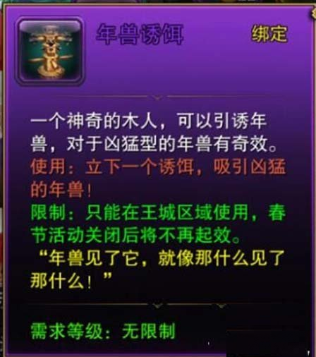 当然玩家也可以前往商城购买捕兽百宝箱(包含1个紫色诱饵和新春爆竹大2个)这是看玩家自身实力所需求,另外年兽也有伤害的尽量别靠近,用诱饵来抵挡伤害。