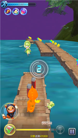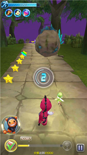 越过藤条赛道不久大家就会遇到第一个麻烦就是滚石赛段了,滚石一直是最难躲的一种障碍物了,在极速模式中躲避的难度就大大的增加了,如果你使用的是其他角色的话就推荐大家跟着星星的道路就好,如果使用魔力可可的话就轻松了许多,使用他的技能不仅可以收集星星还可以摧毁滚石获得摧毁分数一举两得。