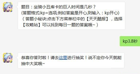 问题的答案是3.8秒,也就是说坐骑小丑库卡的巨人时间是kp3.8秒。