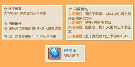 三个两仪是7%+5.6%+7%=19.6%法术伤害*等级。然后10层法宝自身属性60%*等级.这个法宝总属性是19.6%+60%=79.6%。也就是说当人物等级100级的时候,附灵玉可以给人物加79.6的法伤。如果你能弄满所有的两仪属性加的法伤会高点。