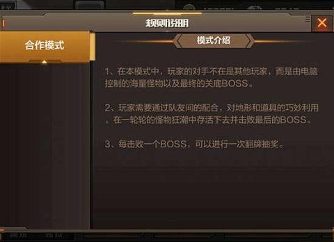 图中是游戏内关于合作挑战模式的规则说明,我在测试中发现,游戏内的关卡和怪物等方面与PC端相比没有过多改变,玩家只需要关注翻牌抽奖这个环节,每击败一个BOSS都可以获得这个机会。