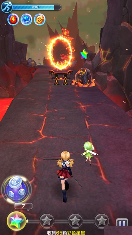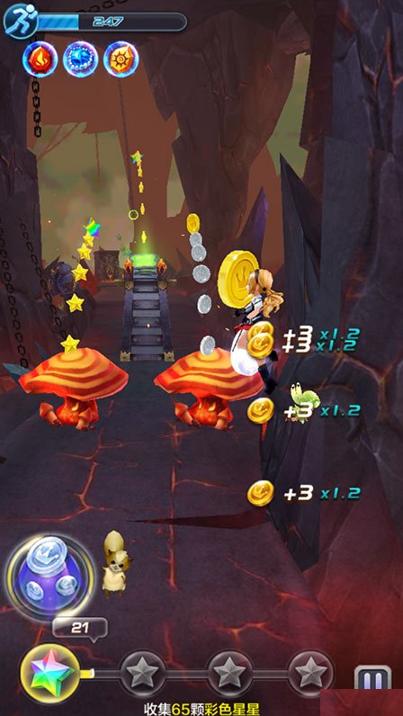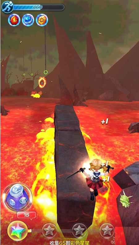 之后就会看到火圈,火圈旁边石头上的彩色星星也是需要我们注意的。玩家们这个时候需要做的就是跳过石头,然后吃到彩色星星就可以了。