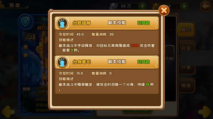 副本中三个技能,分身毫毛和救命毫毛,分别有概率召唤1-2个分身协助战斗,持续15s,由于悟空本身是近战,可以阻挡怪物前期,在召唤分身之后,会有分担伤害,阻挡更多的怪物,并且伤害累积也不容小觑。另外手动技能分筋错骨高伤害且3s眩晕控制,关键时刻救命非常好用。