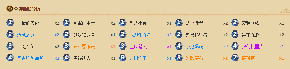 打战士就是优势对局了,现在大部分还是土豪战,奴隶战我只遇到过一个,奴隶战有点劣势,所以我当时就把阿古斯换成了aoe,解场,打土豪战就比较轻松了,就是铺场,举个例子,1费直接上烈焰小鬼,因为小鬼的场攻高,他可以吃3点伤害,也是为了试探他有没有小斧头,如果有,接下来就可以上小蜘蛛,蜘蛛蛋等亡语随从,如果没有就可以上虚空,保护小鬼以求更大伤害,只要场面在,战士就是菜!