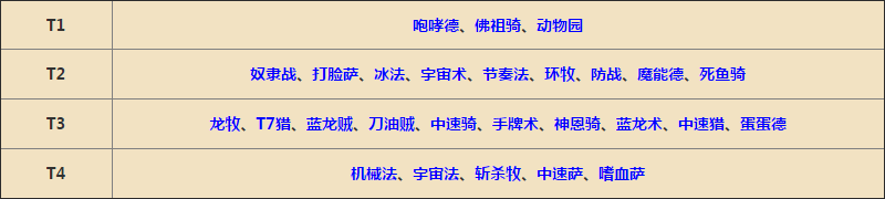T1:当前环境佼佼者,极其完善的系统。T2:有一些弱点但也是天梯及冲传说的有力竞争者。T3:较为中庸的卡组,强度稍缺。T4:极其小众的卡组,仍需要优化。