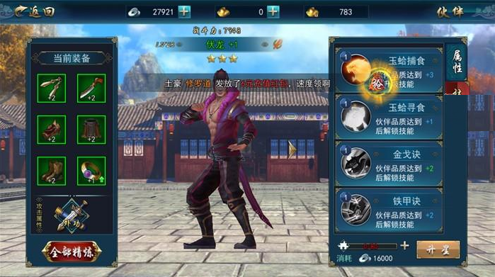 伏龙则为外功输出型伙伴,系统后续会赠送的一个伙伴,并且初始就是3星,属性各方面非常不错,能够提供强大的外功输出。