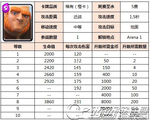 评价:3星。前期值得升级,后期有野猪骑士、骷髅巨人、皮卡、石头人都比他要强力,除非卡组特别需要,否则不用升太高级。