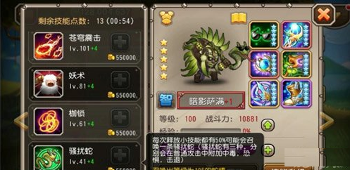 专属觉醒技能“骚扰蛇”,每次释放小技能都有50%可能会召唤一条骚扰蛇(骚扰蛇有三种,分别会在普通攻击中附加中毒,恐惧,击退)。