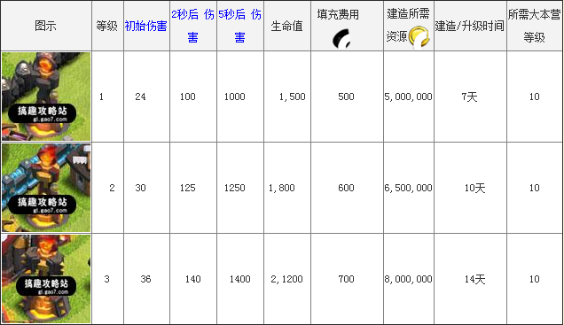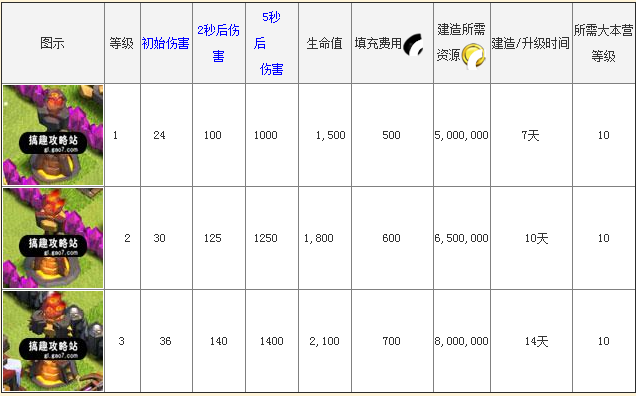 2、地狱之塔升级所需资源、时间及伤害提升等详细数据: