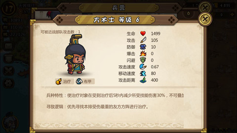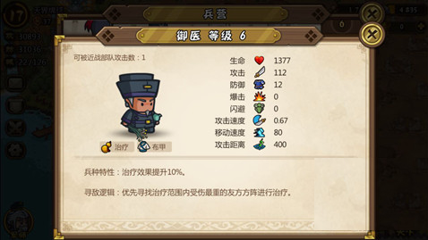 医官是最普通的治疗兵种,最要用来治疗友军,基本上没有任何输出能力,但是作为治疗,在后期是非常重要的,为了最大化提升前排盾兵的防守能力,后排的治疗至关重要!
