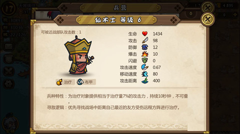 仙术士的兵种特性是能够为治疗对象提供治疗量7%的攻击力加成,持续10秒钟;