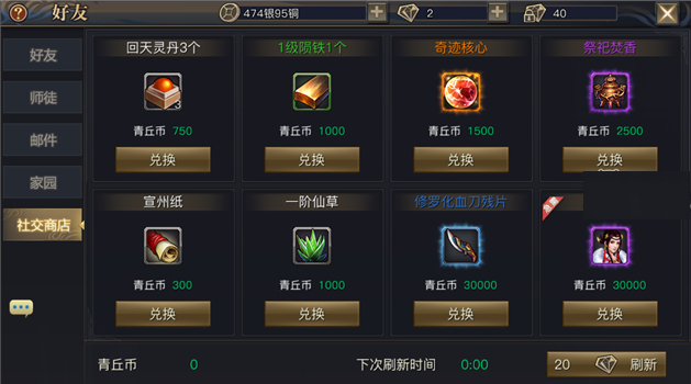 商务的物品通过青丘币兑换,青丘币可以通过种植或跑环任务获得。社交商店的物品是可以刷新更换的,都是比较常用的物品如回天灵丹、损铁、仙草、卡牌、法宝、好友礼物等。