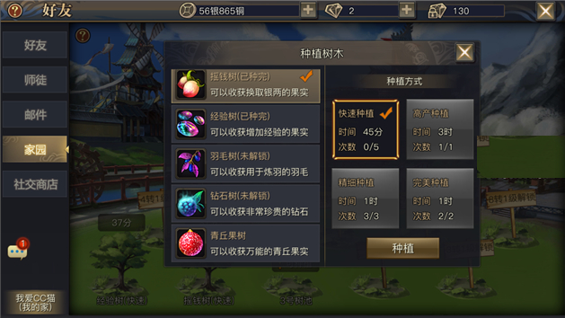可种植的植物有:摇钱树获得银两、经验树获得经验、羽毛树获得羽毛、钻石树获得钻石、青丘树获得青丘币;建议:前期多生产经验树,后面多成产羽毛树或者青丘币。目前可种植的次数也是有限的,目测是随着别墅等级或者VIP等级来限制增加。