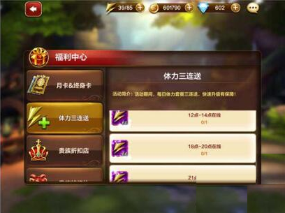 ③.【时段登录】每天12:00-14:00、18:00-20:00、21:00-24:00,三个时间段期间登录游戏,即可获得系统额外赠送的60点体力,三连送必须拿下,快速升级有保障!