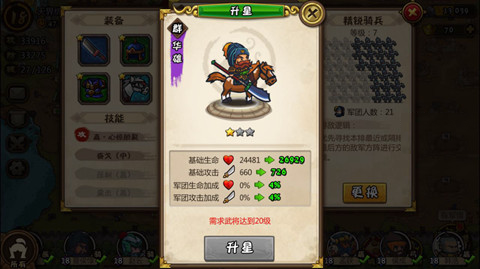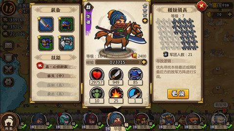 随着君主等级的提升,武将的等级上限以及能够上阵的武将数量也会获得提升,在将军府之中,我们可以对所有的武将进行培养及兵种更换等配置!