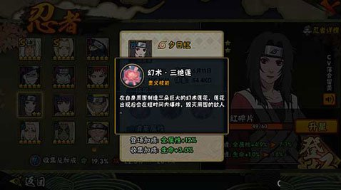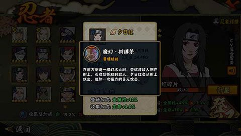 2、魔幻·树缚杀:在前方制造一颗幻术大树,尝试将敌人捆在树上,若成功抓取到敌人,夕日红会从树上跃出,追加一次强力的苦无攻击。