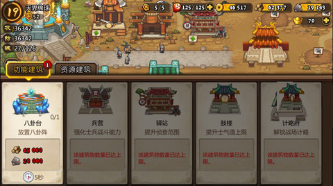 功能建筑物目前一共有五种,分别是兵营、驿站、鼓楼、计略府、八卦台;
