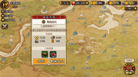 如上图,当君主等级为19级是,地图上刷新了更强的21级的敌人,一般这种情况下的敌人,胜利的条件会稍微调整一下,降低一点难度!