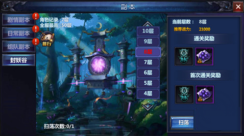 每天可以扫单次数,注意封妖谷是一种推塔玩法,建议每天玩家尽量打到自己能打到的最高层再进行扫荡;可以获得大量的灵羽仙丹以及脉诀奖励!