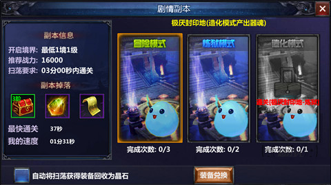 装备获取的主要来源是各种难度的剧情副本,所有通关的剧情副本每天可以完成6次,分别是冒险模式3次,炼狱模式2次,造化模式1次,可以获得大量的装备、晶石、注灵符、晶火、器魂等等奖励!