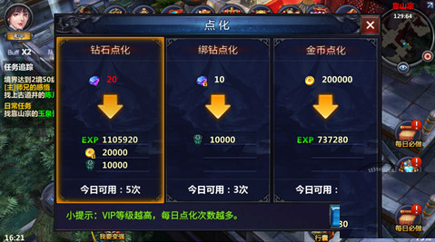 点化直接花去经验,还可以使用钻石或者绑钻点化获取经验,每天可用3次,高级VIP可以点化更多次数;