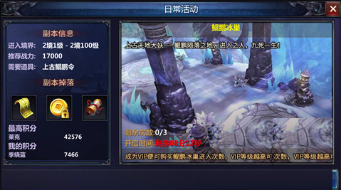 需要上古鲲鹏令才能进入,每天可以进入3次,VIP可以购买次数,还可以获得绑金和晶火灵符奖励;