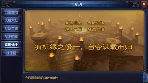 每天开启30分钟,不限进入次数,刷妖怪获得大量经验及绑金奖励;