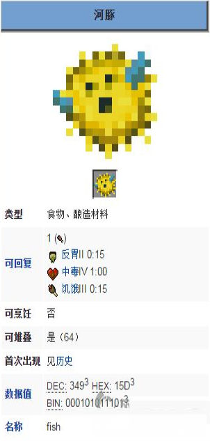 按着右键能吃河豚,每个河豚回复1和0.2饱和度。它也给予玩家15秒的饥饿III、15秒的反胃II和1分钟的中毒IV,使玩家的生命减少到48秒(和平模式30秒)。