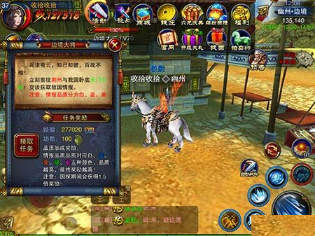 国探就是与敌国内线交接获取情报,玩家需要在边境大将那获取任务,前往荆州与我国卧底天门小校交谈获取敌国情报。情报的品质对应为白,蓝,黄,绿,紫,品质越高最终奖励就会越丰富,而且在国探期间会获得1.5倍的奖励。
