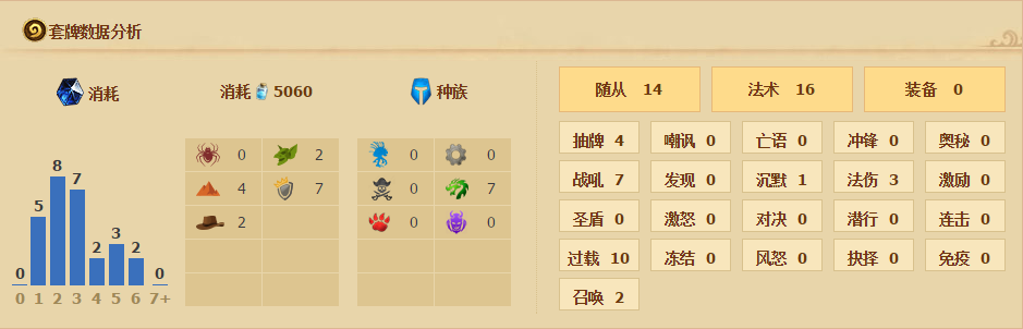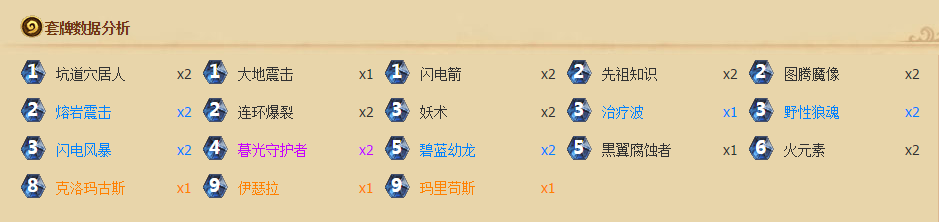 对抗慢速:用快攻打法来打,穴居人配合一些过载卡可以让你在6费的时候配合一波法术来击败对手。这套卡组后期也不怂,有2张硬解妖术来对付对面的大随从,也有足够的后期橙卡来应对场面。
