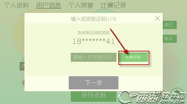 4、如下图所示,弹出更换窗口,点击免费获取验证码,输入验证码,即可更改新的手机号。