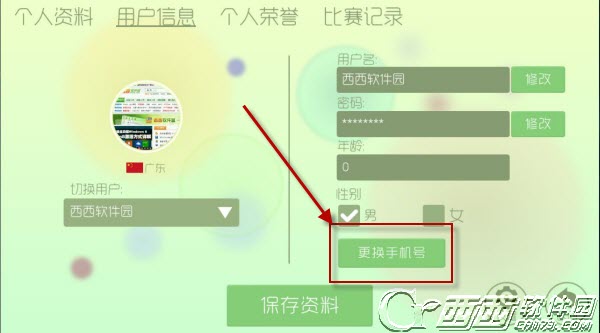 3、在【用户信息】窗口可以看到如箭头标识的【更换手机号】,点击即可。