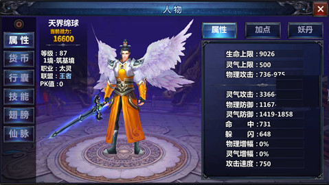 从人物的属性界面可以看到比较重要的一些二级属性,包括生命、灵气、物理攻击、灵气攻击、物理防御、灵气防御等等;