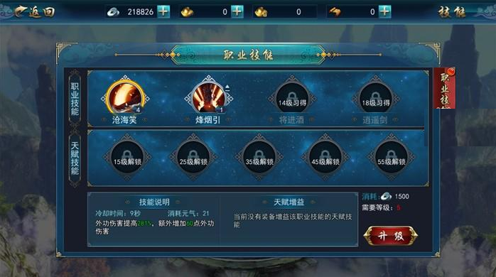战灵将举起自己手中的大刀,飞跃起来猛的向地面砍去,对敌人造成伤害。沧海笑技能冷却时间为9秒,耗蓝32,伤害随着技能等级而提升。