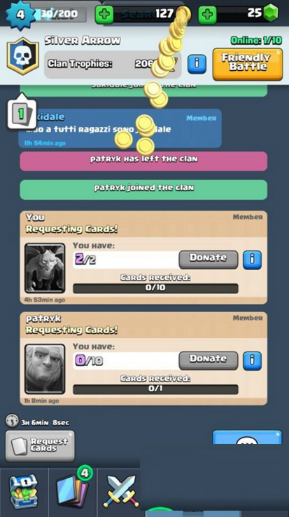 3级加入部落之后,玩家们可以在部落索取卡牌和捐献卡牌,我们这里主要介绍下捐卡,有金币和经验返还(金币不是索求者那里扣除,而是系统发)。