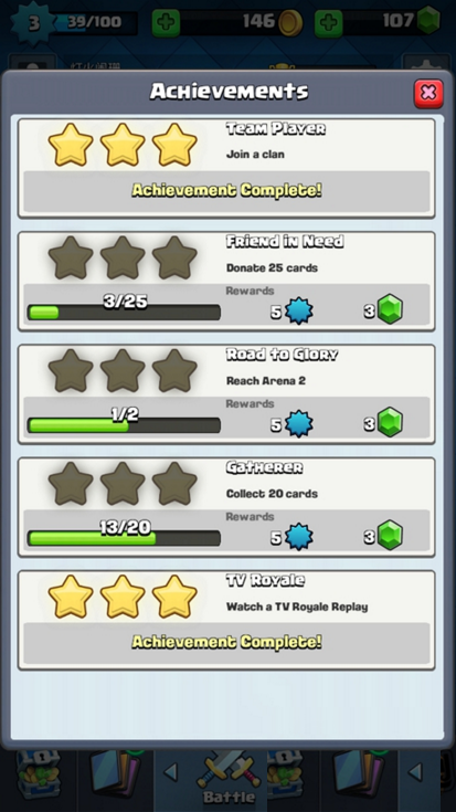 完成成就得到的金币和钻石奖励都是较多的,如加入部落直接得到了100宝石。