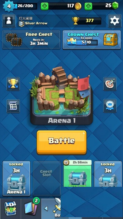 金币和宝石的获取统一途径有开宝箱,宝箱有左侧3小时回复一个的木箱子,还有皇冠宝箱,收集10个皇冠既可得一个金箱子,能开出宝石(按几率)。