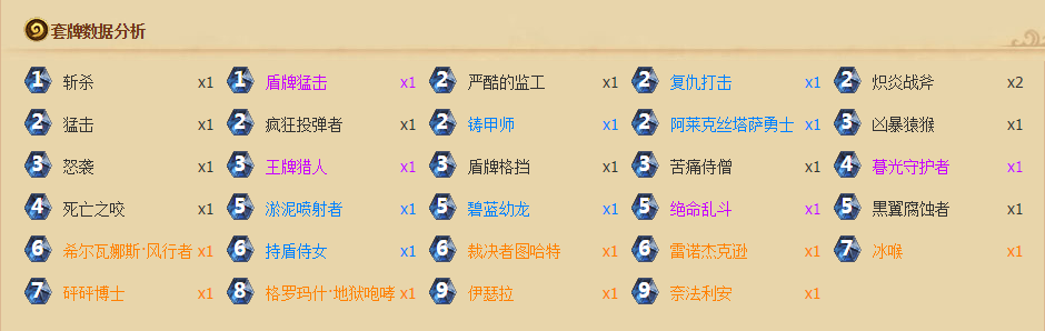 问:我用这套卡打出了21-6的战绩,我用逐星换掉了一把小斧子,不得不说这样效果要比两张小斧子好。感谢楼主介绍这么棒的卡组。
