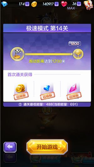 在天天酷跑3D中极速模式第14关又提升了一个难度,本关要求跑动距离达到1200米,通关最低能量需要达到488。那么玩家如何才能三星通关呢?建议大家提升人物的等级使人物体力达到本关要求,下面西西就为大家带来极速模式第14关的三星通关攻略。