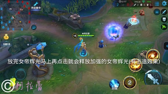 第三 技能使用技巧 第①小点:善用女帝被动技能天命之女和第一技能女帝辉光放小球,连招第二次放的时候有群体击飞爆炸效果,这个很重要,我用的时候都是靠这个输出和粘人(带上冰杖粘的他们不要不要的)。PS:我是这样放技能的,走远一点,最好在女帝辉光距离的尽头(就是技能指针针头位置),先放一次技能(什么技能都行),等冷却,接着放女帝辉光这时候被动技能立马生效刷新女帝辉光再次释放的时候有击退效果而且是击中两次(一次系统判定技能撞击身体产生伤害,另一次是加强的女帝辉光在尽头有爆炸伤害)。